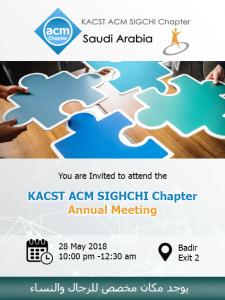 We are delighted to announce the KACST ACM SIGHCHI annual meeting with the chapter’s members. The meeting will give the members the opportunity to view what has been accomplished in the first year and hopefully encourage membership renewals. The meeting will also offer an opportunity to discuss the future of the local chapter for the upcoming year of 2018-2019.
