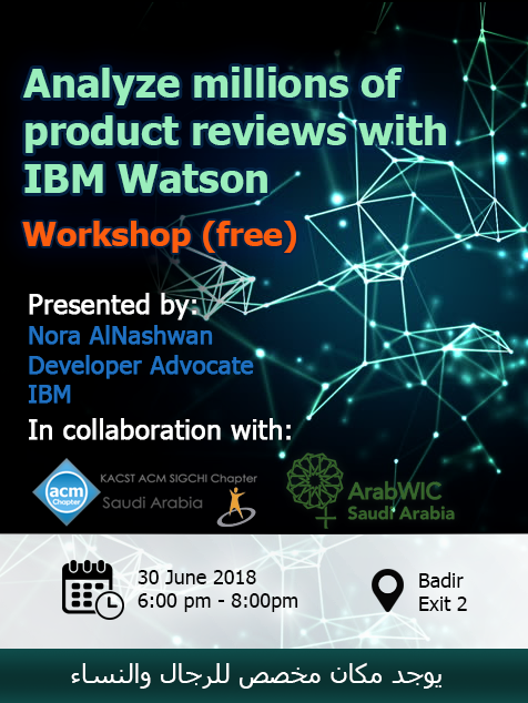 We are delighted to invite you to a workshop that would walk you through the steps on how to analyse millions of product review with IBM Watson. The workshop is presented by Ms. Nora AlNashwan, an IBM developer advocate.